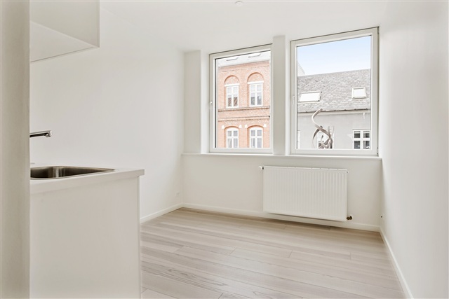 This newly renovated studio apartment is situated in the heart of Vejle and is ready for immediate move-in. The unit features a bathroom equipped with underfloor heating, a washing machine, recessed lighting, a wall-mounted toilet, and a pleasant shower area. The main living space is comfortably connected to the kitchen, which is fitted with a ceramic cooktop, a refrigerator with a freezer compartment, and an exhaust hood. Residents have access to a spacious communal terrace for outdoor enjoyment. Additionally, parking spaces are available for rent near the property. Viewings are offered seven days a week; please get in touch to arrange a visit.