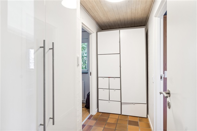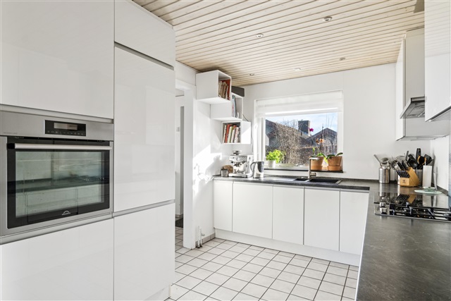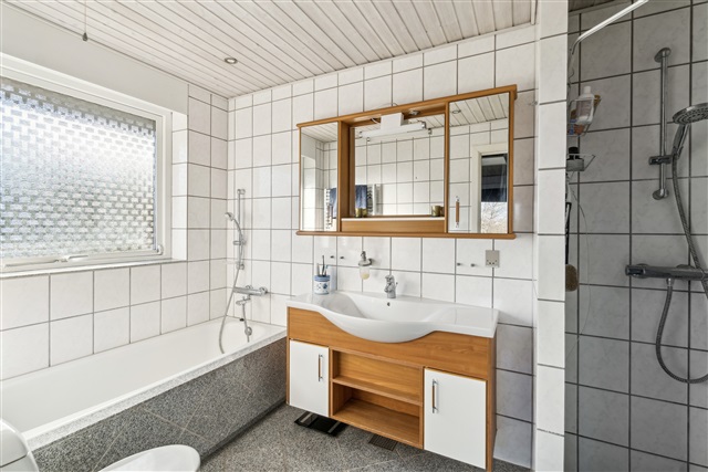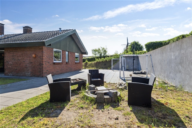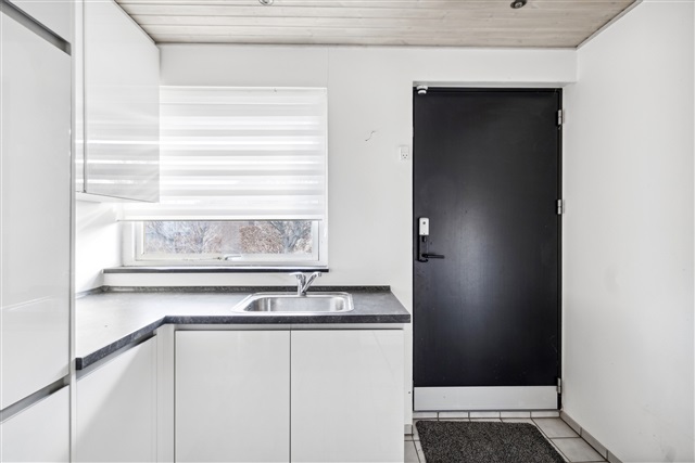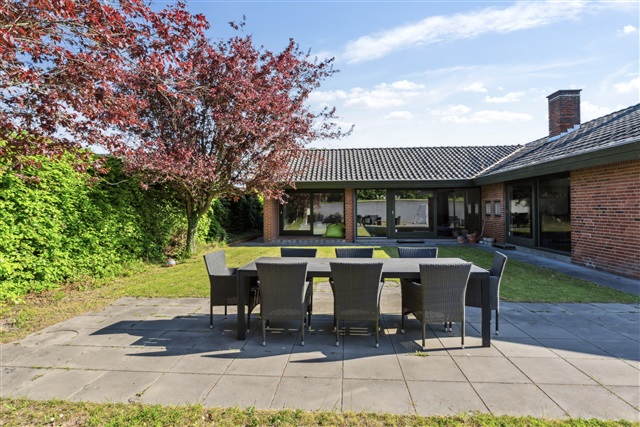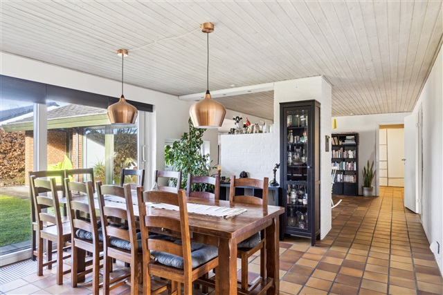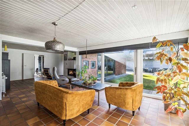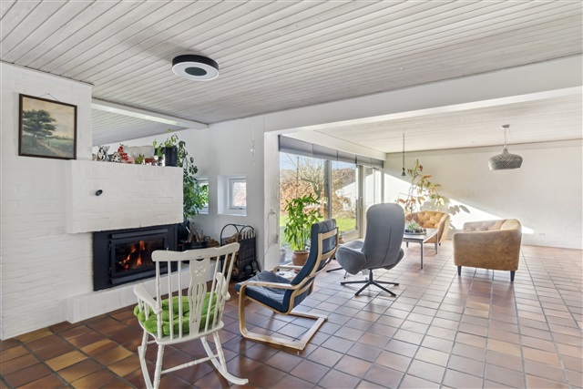 Constructed in 1976, this spacious villa located in Højbjerg covers 171 square meters on a single level, offering a well-balanced layout that combines generous communal living spaces with private bedrooms, making it an excellent choice for a family seeking both space and comfort.Upon entering through the main door, you are greeted by a modest entrance hall featuring built-in storage for outerwear. From here, you have direct access to the home's central living area, the fireplace room, which serves as a cozy and inviting focal point. The chimney is integrated into a half-wall that subtly separates the fireplace room from the adjacent dining area, creating an airy yet intimate atmosphere. Beyond the fireplace room lies the second living room, or lounge, which is connected through a seamless open plan design that allows for flexible room arrangements. This lounge area is expansive and provides direct access to the garden via large sliding glass doors that fill the space with natural light.