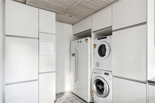 Adjacent to the kitchen is the utility room, complete with a laundry column consisting of a washing machine and dryer, plus a large freezer. The utility room offers direct access to the front yard, a practical feature for managing groceries or handling laundry needs when coming home.
