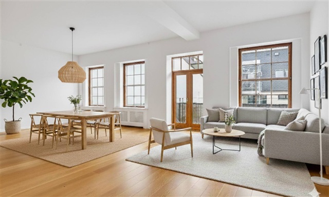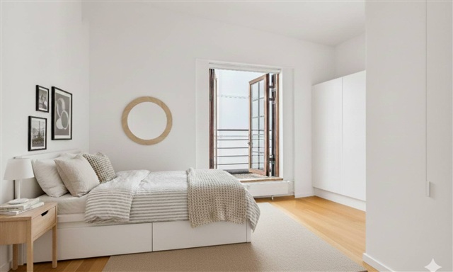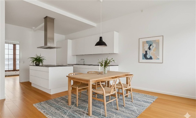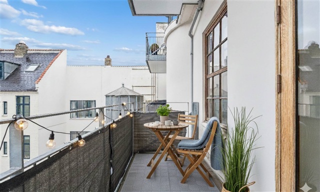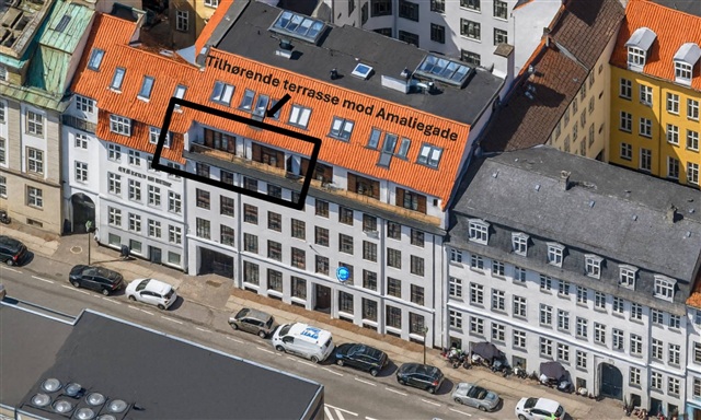 The apartment:This spacious and bright residence is crafted with high-quality materials, featuring wide plank flooring, a large terrace, a Quooker tap, and two bathrooms. Upon entering, you are welcomed by a generous hallway equipped with ample built-in storage. The sizable living room boasts lofty ceilings and grants direct access to a west-facing balcony. Adjacent to the living room is the bright kitchen, which includes a kitchen island and is fully fitted with all necessary appliances, including a Quooker, along with plenty of cupboard space. One of the bathrooms, designed with elegant tiles, contains an integrated towel warmer and a stacked washer and dryer. There are two well-proportioned bedrooms facing Amaliegade, both furnished with built-in wardrobes. From one bedroom, there is direct access to the second bathroom, also adorned with beautiful tiles. Both bedrooms open onto a large terrace overlooking Amaliegade, where the morning sun can be enjoyed.