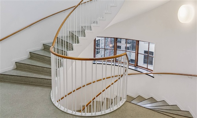 Originally constructed for commercial use, this building has been carefully transformed into residential units while preserving its historic character. A striking spiral staircase connects the floors, adding charm, while an elevator provides convenient access. Residents benefit from secured bicycle parking and private basement storage rooms, offering additional storage options. Access to the communal courtyards is available and open for use by all inhabitants.