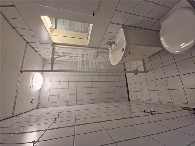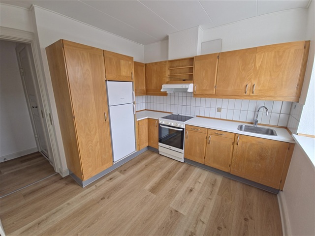 The apartment features bright interiors highlighted by soap-treated plank flooring in both the living room and bedroom. The kitchen is airy and equipped with beech cabinetry, including a dining area. The bathroom is finished with white wall tiles and gray floor tiles, complemented by a glass partition separating the shower area. Please note that a new ceramic stove has been installed.