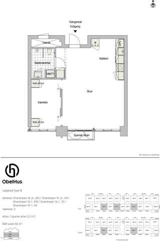 Welcome to ObelhusAt The area on Strandvejen in Aalborg, you will find rental apartments with 1-3 rooms, ranging from 48 to 113 square meters. The apartments have unique floor plans, some featuring a well-utilized loft solution. All apartments have some form of balcony—either a Spanish balcony or a regular one, and some even have both.The building previously served as a factory and later housed classrooms for Aalborg University. Now, the old factory has been transformed into 65 modern, Nordic Swan Ecolabel rental apartments. The apartments in The area are characterized by a New Yorker-style, with high ceilings, steel staircases, exposed piping, and raw walls, which add a modern and unique atmosphere to the apartments.All apartments feature a Stykka kitchen, and the appliances are from Electrolux. The property also offers a large shared rooftop terrace with views over the city and water.Note: Pets are not allowed, and The area is a non-smoking property.All images are reference photos from a model apartment.