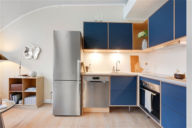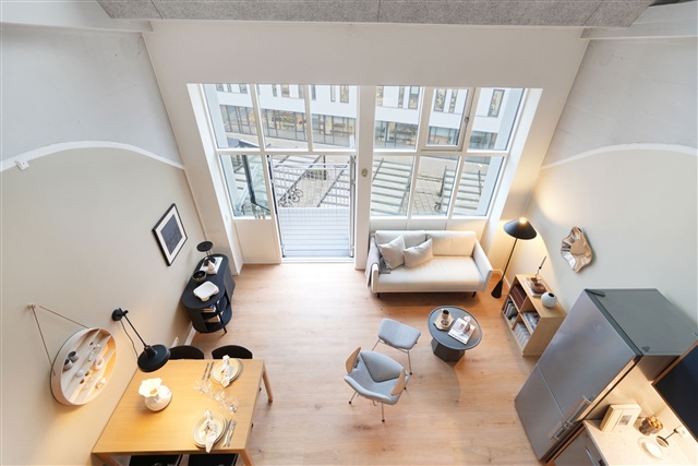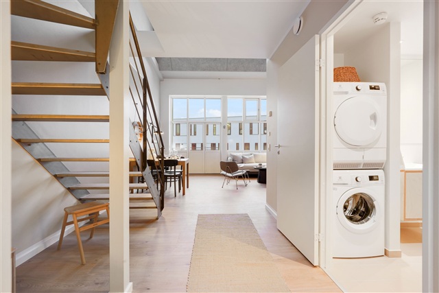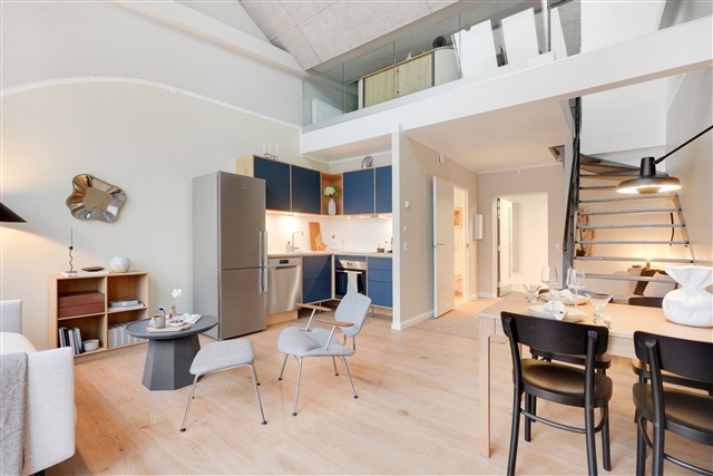 This residential complex, located on Strandvejen in Aalborg, offers rental apartments ranging from one to four rooms, with sizes spanning from 48 to 114 square meters. Each unit features a distinctive floor plan, and some are designed as duplexes that utilize the ceiling height to accommodate an additional room. Every apartment includes some form of balcony-either a Juliet balcony or a traditional one-and several units conveniently have access to both types.The building, which originally served as a factory, was later used by Aalborg University for educational purposes. It has now been transformed into 65 modern rental apartments certified with the Swan label for sustainability. The architecture evokes a New York-inspired aesthetic characterized by high ceilings, steel staircases, exposed piping, and bare walls, contributing to a contemporary and unique living environment. All kitchens are furnished with Stykka units and come equipped with Electrolux appliances. Residents also benefit from a large communal rooftop terrace that offers views overlooking both the city and the water.