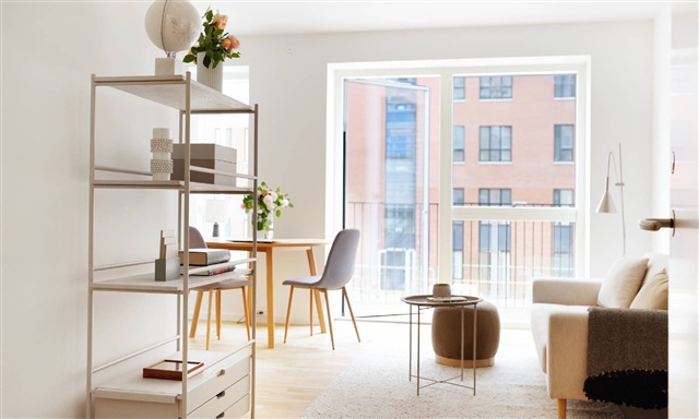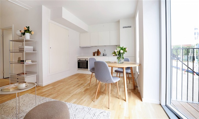 The building itself is part of a handsome courtyard complex designed to foster a vibrant community, centered around shared amenities such as a common house, an orangery, and a courtyard garden. Designed by C.F. Møller Architects, the property comprises 264 apartments. Within the courtyard, residents have access to communal facilities including the charming common house and its accompanying orangery, both thoughtfully created to enhance wellbeing and encourage social interaction. Hørkær Have is set to achieve DGNB gold certification, ensuring an environmentally conscious residence focused on health and comfort. Sustainable materials have been used throughout, indoor air quality has been carefully considered, and valuable communal facilities have been incorporated.