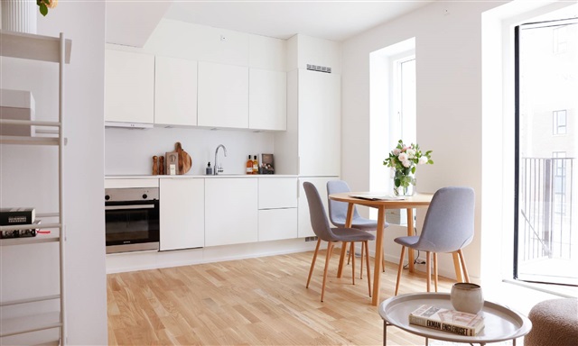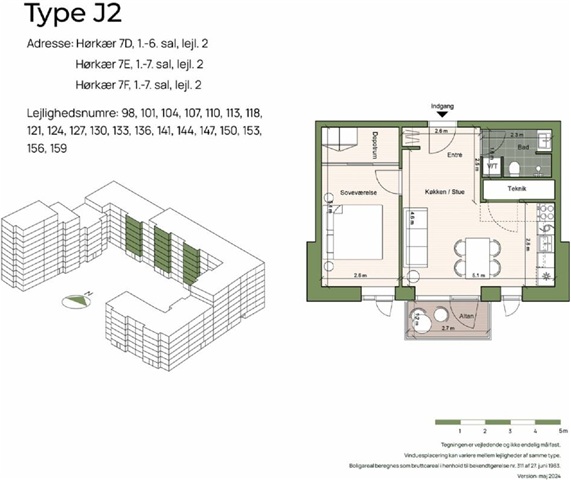 The apartment opens with a welcoming entryway that leads directly into a spacious, open-plan kitchen and living area. The kitchen features an elegant white Svane design, offering a striking contrast against the warm oak parquet floors equipped with underfloor heating. Fully integrated appliances are included, such as a stovetop, fridge-freezer, built-in oven, and dishwasher. This bright and generous kitchen-living space easily accommodates both a dining section adjacent to the kitchen and a cozy seating area. From the living area, access to a large south-facing balcony allows for enjoying time outdoors in the sun, whether with a refreshing drink or a cup of coffee. The bedroom is of a comfortable size, providing ample room for a bed as well as storage solutions. Connected to the bedroom is a storage room fitted with built-in cupboards, offering additional space for organization. The bathroom is adorned with large grey tiles and includes a separate shower cubicle, as well as facilities for a washing machine and dryer.Please note that the photos might depict a different unit; therefore, interior layout, location, and view may differ. However, all residences in the building share the same materials and quality. Refer to the floor plan for the specific layout of this apartment.