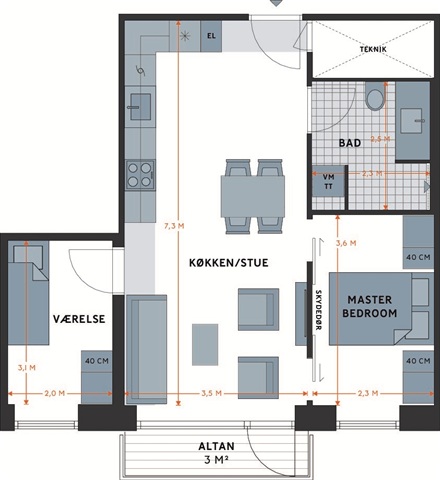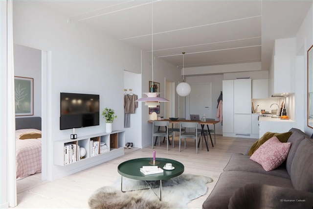 Please note that the images shown are renderings and may not depict the specific apartment; they could represent other flats or townhouses within the same complex. Upon entering this residence, you step straight into an open kitchen and living area offering ample space for both a dining table and a seating arrangement. From here, access is granted to two bedrooms as well as a south-facing balcony.The building, Albertina Hus, is situated directly adjacent to the charming Lagergade and Kedelpladsen, where shops and restaurants are readily available. This property comprises 28 units ranging from two to five rooms, with sizes spanning from 61 to 110 square meters. Additionally, the building includes two penthouse apartments, each featuring their own impressive rooftop terraces. All homes are equipped with Miele appliances, including a washer and dryer.
