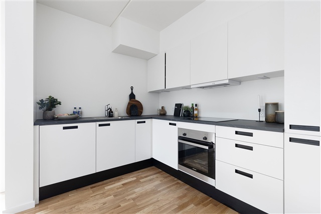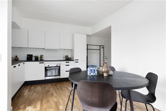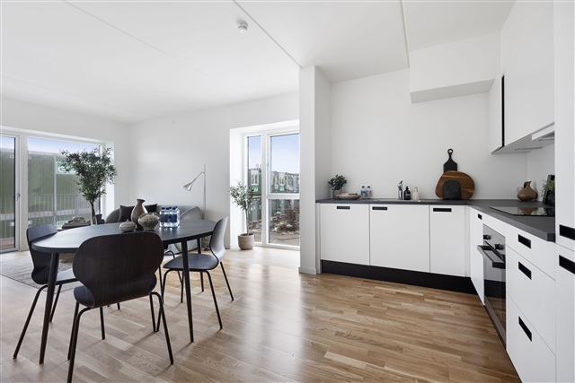 The senior apartments have been designed with an emphasis on both comfort and practicality. Each unit features a modern kitchen and a high-quality bathroom equipped with built-in appliances. The building is accessible via an elevator, ensuring ease of movement between floors. Within Kalvehaven, residents enjoy bright and inviting living spaces thanks to white walls, door frames, and doors, complemented by elegant parquet flooring and large windows that allow natural light to fill the rooms. Those residing on the ground floor can take advantage of a private terrace, while upper-floor residents benefit from a balcony.When applying to rent one of these homes, prospective tenants will undergo a credit assessment based on their CPR number. It is important to note that anyone registered with RKI is not eligible to rent a unit. Please be aware that the photos provided do not depict the specific apartment offered.