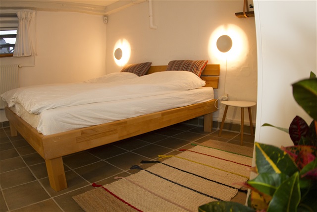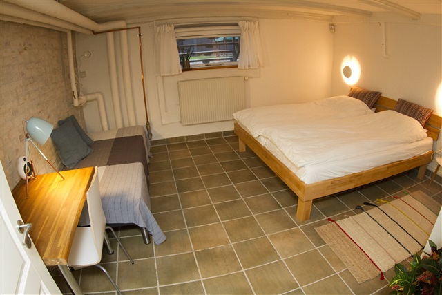 One large bedroom with a doublebed and one single bed, wardrobe closet and small desk.