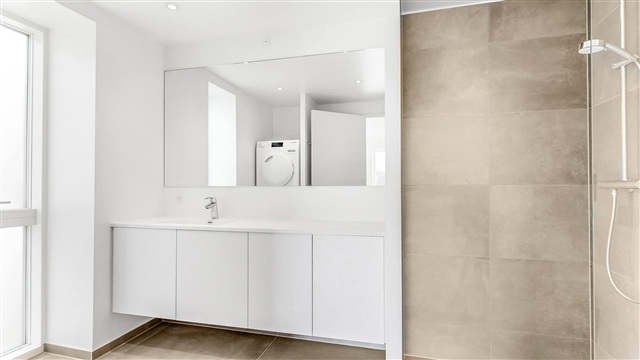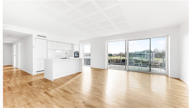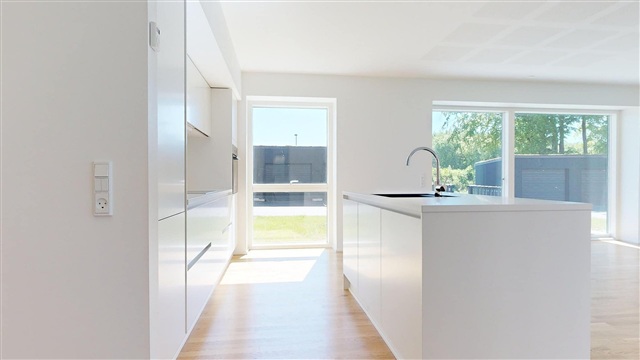 Teglgårdshaven represents one of the most distinguished and captivating residential developments ever seen in Viborg. Its location is widely recognized by locals, especially those familiar with the scenic walking or running routes around Søndersø. Positioned right at the corner of this lake, the new elegant buildings rise where the original red structures once stood, known for housing the esteemed Viborg painter Lasse Winsløw from 1953 until 2006. These freshly constructed buildings pay careful homage to the character of the area and to the historic Teglgård. Adjacent to the development lies Strandparken, featuring amenities such as a slipway and boat moorings, enhancing the unique setting that combines proximity to the town's edge with natural surroundings.The complex includes three tower buildings, each containing eleven apartments, with the apartment in question located on the first floor. This particular unit spans 107 square meters and comprises two bedrooms, a bathroom, and a spacious combined kitchen and living area that offers magnificent views over Søndersø. The kitchen and fixtures are supplied by reputable brands including HTH and Miele. Residents have the option to apply for permission to keep pets. Convenient parking options are available along with dedicated bicycle parking spaces situated in front of each tower. The surrounding grounds are thoughtfully designed with natural elements, notably a large rainwater pond and a communal park, which all tenants of Teglgårdshaven are welcome to enjoy. Please note that the photos and floor plan provided are for guidance only.