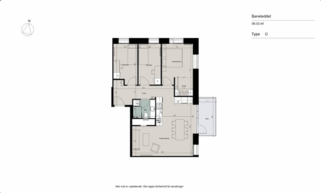 This charming and efficiently designed apartment welcomes you into a bright entrance hallway that also serves as a central distribution area. From here, you gain access to two well-sized rooms, each sufficiently spacious to accommodate both a bed and a desk. Adjacent to these is the large master bedroom, which includes a connected storage room that can conveniently be repurposed as a walk-in closet if desired. The hallway also leads to the bathroom, featuring a timeless and elegant design with ample space, a separate shower stall, and equipped with both a washing machine and a tumble dryer. The spacious kitchen-living area is filled with natural light and boasts a fully appointed white kitchen, including a fridge-freezer, oven, stovetop, extractor hood, and dishwasher, accompanied by generous storage options. The living room is thoughtfully arranged to provide flexible use, making it possible to set up both a lounge and dining zone effectively. This living space extends onto a large east-facing balcony where you can enjoy sunlight and fresh air while overlooking the nearby residential neighborhood consisting of villas.Underfloor heating is installed throughout the entire apartment and can be individually regulated in each room to suit personal preferences.