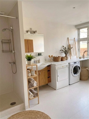 A notably spacious bathroom is thoughtfully arranged, featuring a large shower area, an extensive mirror surface, and a convenient laundry corner with a washer and dryer. Windows allow daylight in and facilitate easy ventilation.