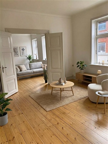 Step inside this move-in ready apartment spanning 120 m², where traditional features such as high ceilings, wide plank flooring, and elegant double doors blend seamlessly with contemporary comforts. The layout is bright and adaptable, offering two adjoining living rooms and two bedrooms, allowing for flexible use - whether you need extra sleeping quarters, a home office, or an expansive combined living and dining area.The kitchen is designed to be both airy and practical, equipped with ample cabinetry and counter space, a dishwasher, oven, stovetop, and fridge/freezer. There's also room for a dining table by the window. Natural light pours through large windows throughout the home, creating a serene and welcoming environment.