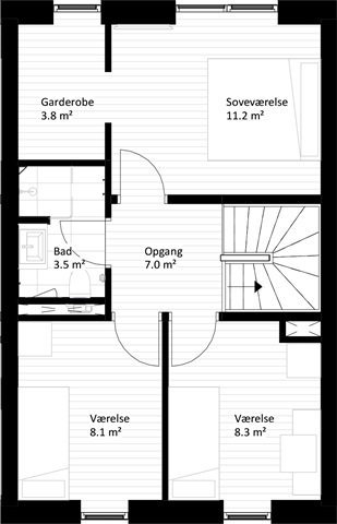 An elegant, inconspicuous staircase directs you to the first floor, where the master bedroom awaits, complete with a walk-in closet. Two additional rooms on this level can be adapted flexibly as children's bedrooms, a home office, or guest rooms, depending on your needs. Each room includes built-in wardrobes that provide generous storage and help maintain an organized atmosphere. The dwelling features two bathrooms, one per floor, adding to the convenience for both families and couples. Beneath the stairs, useful storage space is allocated, perfect for items like vacuum cleaners and shoes.