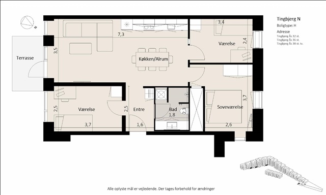 This newly constructed four-room apartment in Tingbjerg offers an excellent living space suitable for families or anyone needing additional room. Its well-thought-out layout features two bedrooms situated adjacent to each other, while the fourth room is conveniently located near the kitchen and dining area. This flexible space can function as a home office, a child's bedroom, or a guest room, catering to various needs.The apartment includes a contemporary Invita kitchen equipped with built-in appliances, seamlessly connected to a bright and spacious open-plan living and dining area. From this communal space, access leads directly to a balcony, allowing for fresh air and sunlight. The bathroom is designed with modern fixtures and incorporates both a washing machine and a dryer. Throughout the entire dwelling, underfloor heating contributes to a comfortable indoor climate regardless of the season.