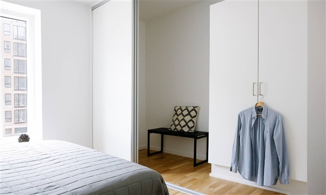 The layout of this well-designed apartment begins with an inviting entrance hall, leading into a spacious open-plan kitchen and living area. The kitchen features a pristine white Svane design that contrasts beautifully with the warm oak parquet flooring equipped with underfloor heating. Fully outfitted with modern appliances, the kitchen includes a cooktop, a combined fridge and freezer, a built-in oven, and a dishwasher. The bright and expansive kitchen-living room can accommodate a dining space adjacent to the kitchen as well as a cozy lounge area. From this main living space, there is access to a generously sized balcony facing south, offering ample opportunity to enjoy outdoor living and soak up the sunlight while sipping a cold beverage or a good cup of coffee. The bedroom is spacious enough to comfortably fit both a bed and storage solutions. Beyond the bedroom lies a storage room containing built-in wardrobes and additional space for storing belongings. Furthermore, the additional room presents multiple possibilities, whether you require a child's bedroom, an office, or a guest room. The bathroom is adorned with large elegant gray tiles and features a separate shower area. It is also equipped with both a washing machine and a tumble dryer.Please note that the photographs may depict a different unit, meaning that interior arrangement, location, and views can vary. However, the same quality of materials and craftsmanship applies to all residences within the building. The floor plan provides the detailed layout of this specific apartment.