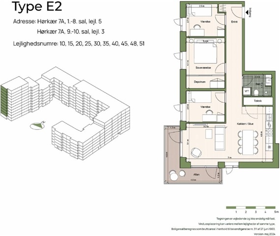 Upon entering the residence, one is welcomed into a serene and inviting atmosphere that permeates the entire home. This spacious four-room apartment features an efficient layout complemented by large windows that fill the space with abundant natural light, as well as underfloor heating throughout. The entrance hall offers a practical area for hanging coats and storing shoes before you proceed into the expansive open-plan kitchen and living space. The kitchen is equipped with a sleek white Svane design, which stands out elegantly against the warm oak parquet floors. Comprehensive kitchen appliances include a cooktop, built-in oven, refrigerator and freezer, along with a dishwasher. The open kitchen-dining area is spacious enough to accommodate a dining table adjacent to the kitchen as well as a comfortable lounge section for relaxation. From this room, there is direct access to a generously sized balcony facing the courtyard, providing an ideal spot to enjoy outdoor living and sunshine with a refreshing drink. The main bedroom is well-proportioned, allowing ample space for both a bed and storage solutions. Connected to the bedroom is a storage room fitted with built-in closets, offering additional room for belongings. The two remaining rooms vary slightly in size and can be utilized flexibly, whether as a shared living arrangement, a home office, or children's bedrooms. The bathroom is tiled with elegant large gray tiles and includes a separate shower area, as well as facilities for a washing machine and dryer. It should be noted that the photographs may depict a different unit within the building; therefore, the interior layout, view, and location might differ, although material selections and quality are consistent throughout all homes in the property. Consult the floor plan for the specific layout of this apartment.The property itself is an impressive block designed by C.F. Møller Architects, providing a strong foundation for community living, centered around its communal house, orangery, and courtyard. Housing a total of 264 apartments with configurations ranging from two to five rooms, the development caters to both smaller and larger household needs. The courtyard area includes several communal amenities, notably a charming community house accompanied by a cozy orangery intended to promote wellbeing and foster a flourishing community spirit. Residents have the option to obtain a parking permit, which is available at a monthly cost of 400 DKK. Hørkær Have is positioned to achieve DGNB Gold certification, ensuring that environmental considerations along with the health and wellbeing of residents have been prioritized. Sustainable materials have been incorporated, indoor air quality has been carefully managed, and thoughtful shared facilities contribute positively to the overall living experience.