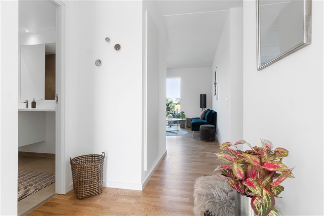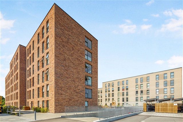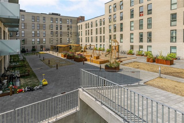 Located in Roskilde, this residential complex was constructed in 2019 and features a contemporary architectural style. The building's street-facing facades are clad in dark red brick, while lighter tones are used on the courtyard side. Each apartment includes balconies made from galvanized steel, complementing the building's design with a light and airy appearance. Spanning five floors, the property contains a total of 121 units with layouts ranging from two to four rooms.Residents benefit from several shared amenities, including a large rooftop terrace, a communal room, and a green courtyard equipped with a playground, barbecue area, small garden beds, and bicycle parking. Additionally, there is an underground parking facility available for both cars and bicycles. The apartments themselves are fitted with modern features such as oak parquet flooring in the entrance, living room, bedrooms, and kitchen. The kitchens are supplied by Tvis Køkkener, ensuring Danish quality combined with sleek design.