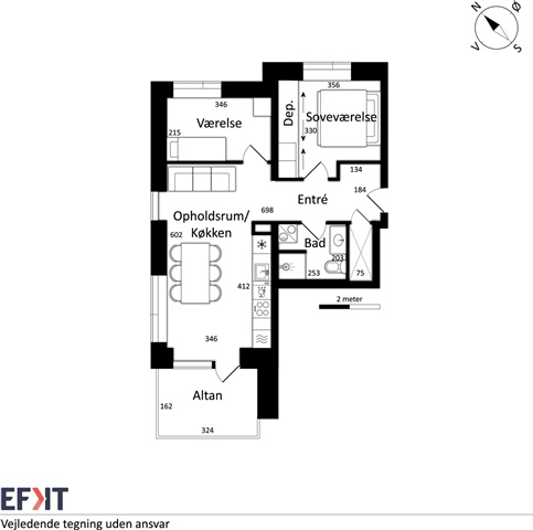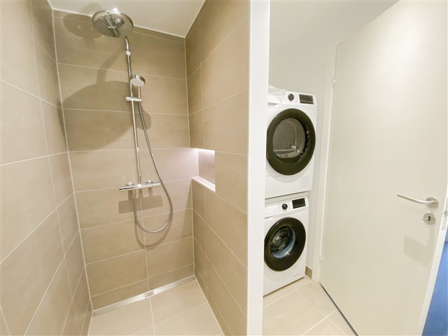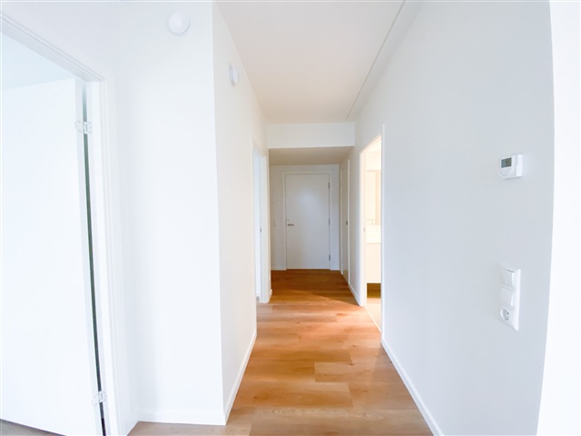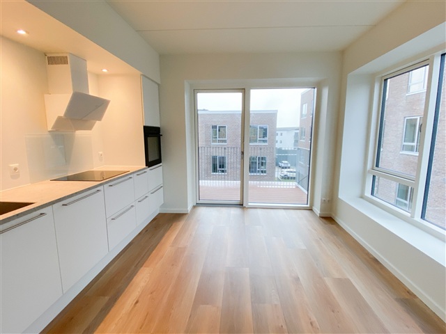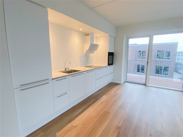 The Strandhusene complex consists of architecturally harmonious buildings arranged in a four-winged layout, providing residents with a pleasant courtyard space nestled among staggered levels. Several apartments within this development offer impressive views facing south, overlooking Limfjorden and Lindholm Strandpark. The property appeals to a diverse group of occupants, including new parents, mature couples, and singles seeking a higher standard of living.This bright and well-designed apartment features an open kitchen-living area that extends onto a private balcony oriented to the south, allowing abundant natural light and fresh air inside. The kitchen is fitted with high-end Svane cabinetry and includes a full suite of modern appliances such as an induction cooktop, pyrolytic oven, fridge/freezer unit, dishwasher, washing machine, and tumble dryer. In addition to two bedrooms and a stylish bathroom, the unit is enhanced by quality finishes including acoustic flooring and underfloor heating, contributing to a peaceful and comfortable living environment. The communal courtyard between the four buildings fosters an inviting atmosphere ideal for relaxation and neighborly socializing. Parking options are available, and every apartment benefits from access to a dedicated storage room.