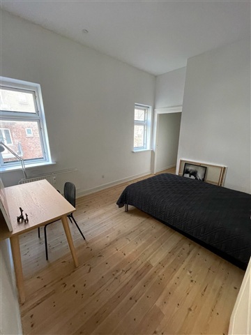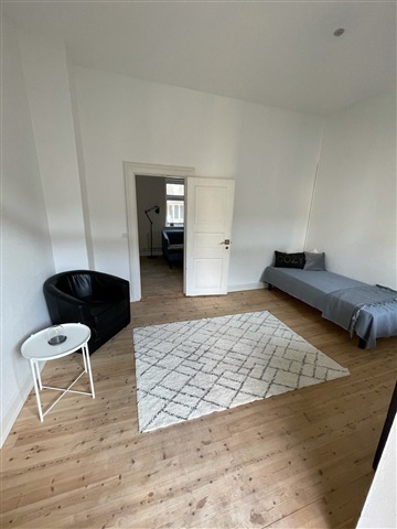 The apartment spans 117.9 square meters, a gross measurement that includes a portion of the shared common areas. It comprises five rooms along with a small storage closet, which is well-suited for use as either a wardrobe or additional storage space. The unit features a private bathroom and a well-maintained kitchen. Within the kitchen, ample cabinetry and counter space are provided, along with a sink, a stove equipped with a vent hood, and a combined refrigerator/freezer. All walls throughout the apartment are painted white, and it includes its own washing machine and tumble dryer. The bathroom is fitted with a separate shower stall. Additionally, the corridor outside can effectively serve as a balcony space.The layout of the apartment is designed to accommodate sharing by one or two roommates, allowing each person to enjoy privacy in their individual bedroom.