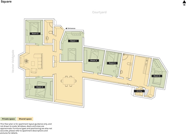 The apartment building is from 1900. There are a total of six rooms spread around the apartment, with two couple rooms and four single rooms. The uniqueness of this apartment is the large and spacious living room and dining room that are connected at the center of the apartment. This gives it the perfect hangout area, for movie nights, house dinners, game nights or just casual reading. There are two big bathrooms at each end of the apartment. The hallway leads to an open kitchen where there is lots of room for multiple people to make food simultaneously.