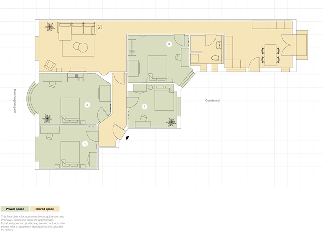 This beautiful apartment is fully renovated and opened it's doors in 2021. The apartment has 4 single bedrooms, a brand new spacious bathroom and a fully equipped kitchen with large dining table, a large separate living room with sofa, lounge chairs, TV, etc. and a private balcony facing the green backyard.- Balcony/terrasse