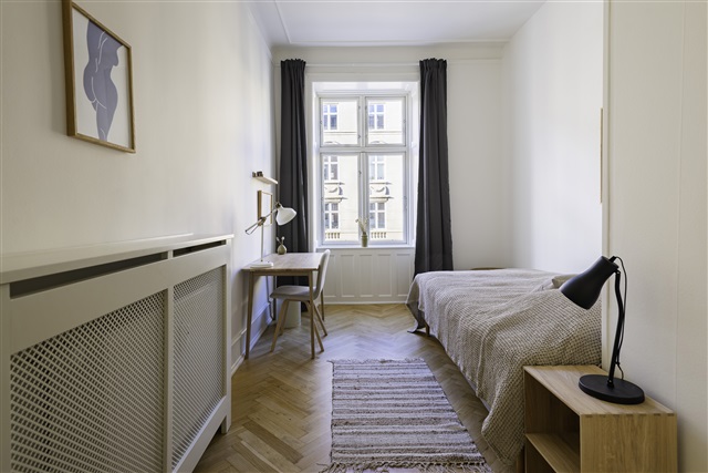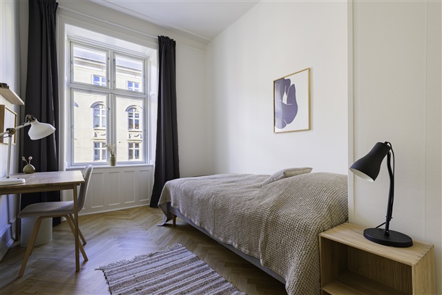 'Harald' is a newly renovated apartment ideal for co-living with 5 nicely sized bedrooms, spacious dining kitchen and a large livingroom. From the main hallway you have access to the modern bathroom and a separate toilet. In 2020 the apartment got a brand new large balcony facing the backyard. The shared backyard is typical for traditional Copenhagen apartment buildings, where you can enjoy the calmness sitting at one of the tables or relax on the green lawn during summertime enjoying the sun or having a barbecue.High-quality bed with bedspread, duvet and pillows