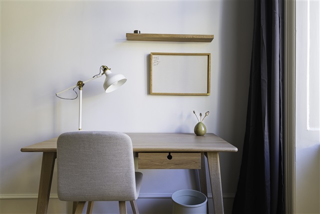 Desk with desk chair and desk lamp Wardrobe with hanging space and drawers