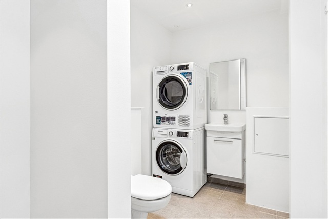 Careful attention to detail is evident across the apartment with modern, handleless cabinetry in white installed in the kitchen, bathroom, utility room, and bedrooms. Countertops are white and stylish, paired with large stainless steel sinks. The bathroom is outfitted with a wall-mounted toilet, premium fixtures, and modern gray tiles in the shower niche. All major household appliances are included and of recognized high quality, featuring an integrated refrigerator/freezer, built-in dishwasher, induction cooktop, extractor hood, and an oven. A washing machine and tumble dryer are also part of the package.