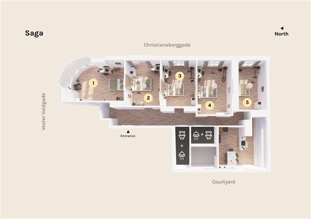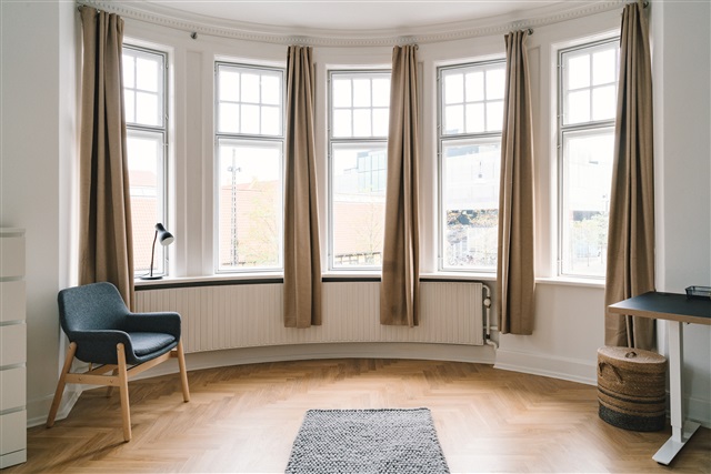 This classy city centre home consists of five spacious single rooms, two shared bathrooms and one open kitchen with a cozy lounge area. The apartment is located on the 1st floor of a monumental building and is in the same building as our popular Loft, Blox and Vestervold apartments. All bedrooms have big windows on the quiet sidestreet called 'Christiansborggade'. A cosy coffeebar on the ground floor of the building opened in the summer of 2020, where there is seating outside to enjoy a ray of sunshine and some good company. The apartment is a stone throw away from the canal, where you can swim in summer, and around the corner of Tivoli, BLOX and the Royal Library. The new metro line which runs all around the city centre and the main station are a 10 min walk away.