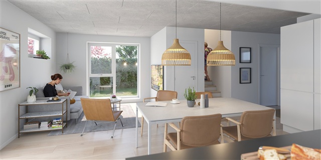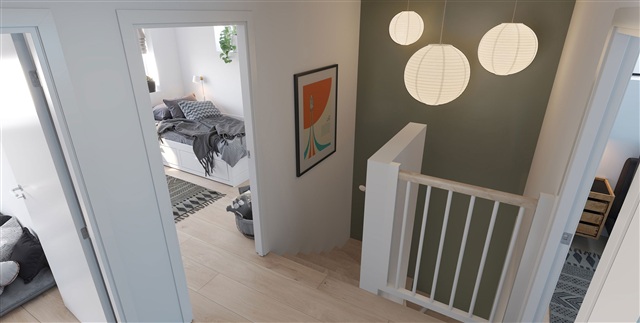 On the ground floor you'll find an entrance hall with plenty of space for storing outerwear etc. and a separate utility room with technical installations and a worktop with sink, washing machine and dryer. From the hallway you have access to the bathroom and the open and bright kitchen family room. The family room is furnished with an angled kitchen with space for a dining table and the possibility of a cozy sofa corner. A wide staircase leads to the first floor with a large bedroom with three built-in wardrobes and three bedrooms.
