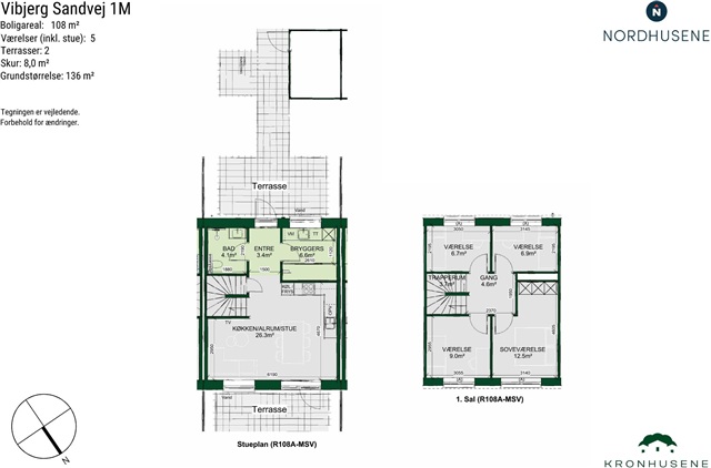 On the ground floor you'll find an entrance hall with plenty of space for storing outerwear etc. and a separate utility room with technical installations and a worktop with sink, washing machine and dryer. From the hallway you have access to the bathroom and the open and bright kitchen family room. The family room is furnished with an angled kitchen with space for a dining table and the possibility of a cozy sofa corner. A wide staircase leads to the first floor with a large bedroom with three built-in wardrobes and three bedrooms.