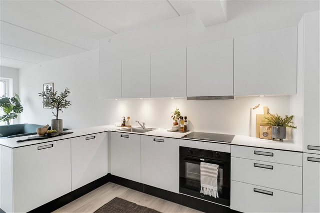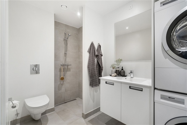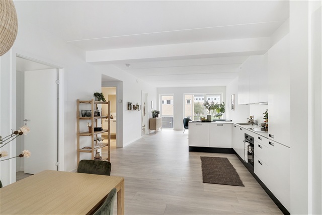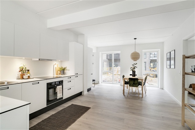 The Bornholmerhusene residential complex in Taastrup stands out as an attractive combination of contemporary design and practical living. Situated in a peaceful and scenic neighborhood near Taastrup Station, this property has long been favored by both families with children and young professionals who seek a safe, convenient location with easy access to Copenhagen. The apartment features a spacious kitchen-living area arranged in an open plan, a well-sized bathroom equipped with a washer-dryer unit, and access to a private balcony or terrace. Underfloor heating runs throughout every room, eliminating the need for radiators that could obstruct the pleasant views of the surrounding landscape visible through the large, floor-to-ceiling windows.The heart of the apartment is the kitchen-living space, generously designed to allow for a large dining area. The kitchen is finished in white with ample additional cabinet space, and in some units, a kitchen island is included to create a harmonious flow within the expansive room. The bathroom maintains a modern aesthetic with clean, light tones; white walls complement the light gray or sand-colored tiles found on the floor and inside the shower cubicle. Amenities include a wall-mounted toilet, a large mirror, sufficient storage options, and a washer-dryer set from Gram. Like the other rooms, the bathroom benefits from underfloor heating.