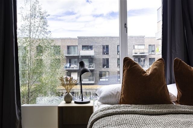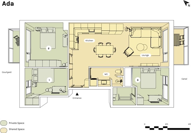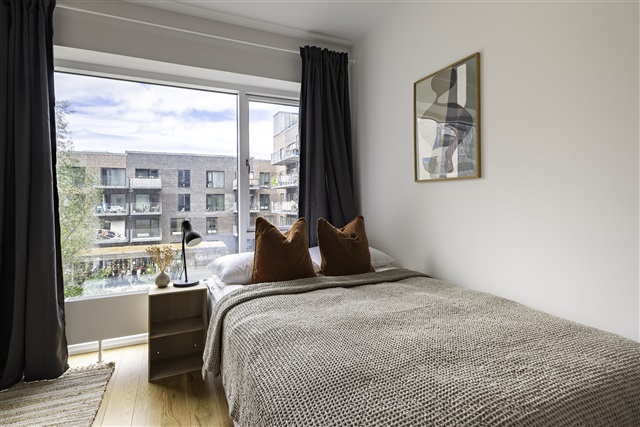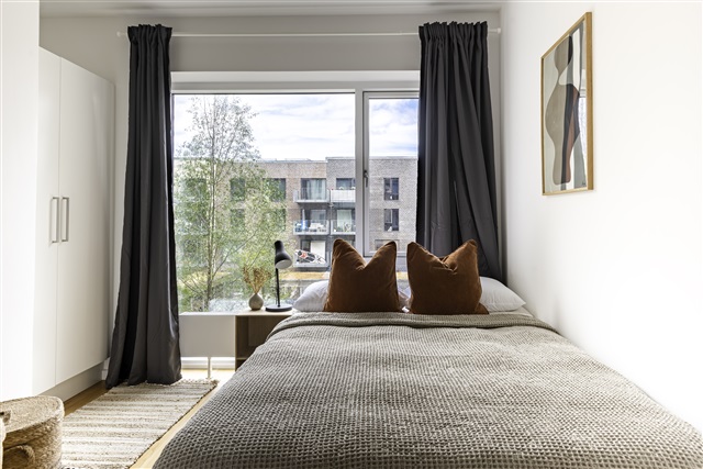 Ada is a three-bedroom apartment designed to accommodate three tenants, located in a quiet and residential area. It comes fully furnished and includes a shared living room that opens into a contemporary kitchen, which leads out to a balcony. There is one large bathroom available. The second bedroom features its own private balcony, while the third bedroom is equipped with a spacious walk-in closet.Each bedroom is furnished with a high-quality bed complete with bedspread, duvet, and pillows. Additional furniture includes a bedside table accompanied by a reading lamp, as well as a desk paired with a desk chair and desk lamp. Storage solutions include spaces for hanging clothes and drawers, along with storage boxes placed under the bed. The apartment is also equipped with curtains, a mirror, a laundry basket, a trash can, rugs, and decorative elements.