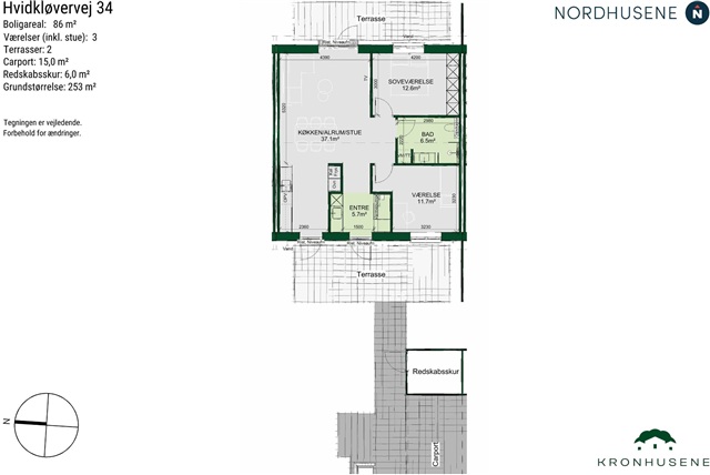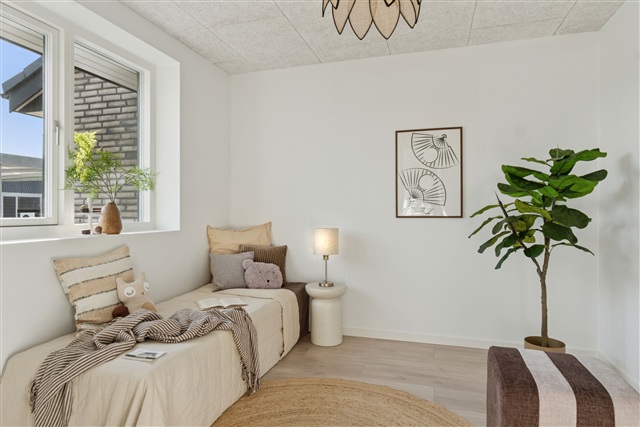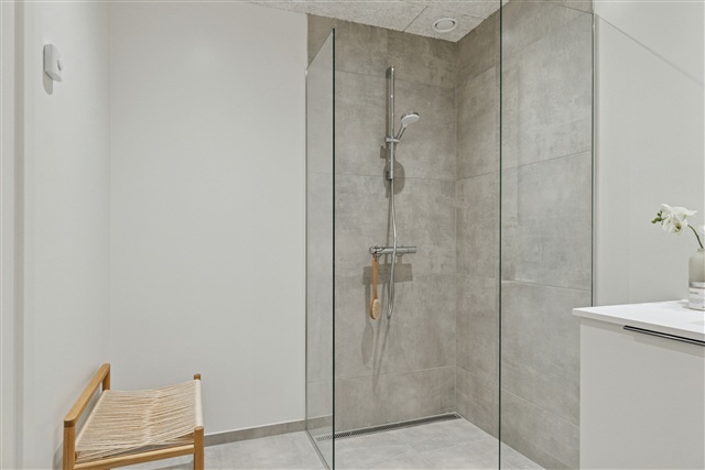You enter the spacious entrance hall with the house's technology and a small worktop with sink. From here you enter the family room with plenty of natural light from large windows to the floor. The family room has a kitchen and plenty of space for a dining area and a cozy sofa corner. From the family room you will find a large bedroom with full closet wall, bathroom and larger room. From the family room there is access to both the front and back terraces.