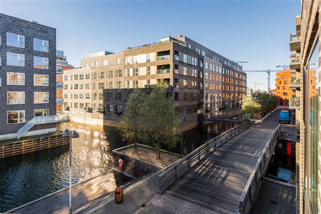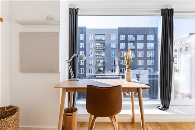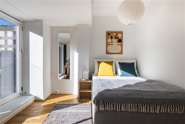 The apartment features elegant wooden flooring throughout, expansive double-glazed windows, and is equipped with central heating along with a video intercom system. Each room is fitted with underfloor heating, which can be individually adjusted via separate digital thermostats. There are four spacious bedrooms, each containing built-in wardrobes. The kitchen is notably large and open, including a secondary countertop on a kitchen island accompanied by bar stools. Adjacent to the kitchen is a dining space and a distinct living area furnished with a television. The accommodation includes a single bathroom outfitted with a washing machine and dryer, as well as a separate toilet for guests.In terms of furnishings, the bedrooms come with high-quality beds complete with bedspreads, duvets, and pillows. Each room has a bedside table with a reading lamp, a desk paired with a desk chair and lamp, and a wardrobe offering both drawers and hanging sections. Additional storage is available in boxes placed beneath the bed. The apartment's accessories include curtains, a mirror, a laundry basket, a trash bin, rugs, and decorative items, although not all of these are shown in the photographs.