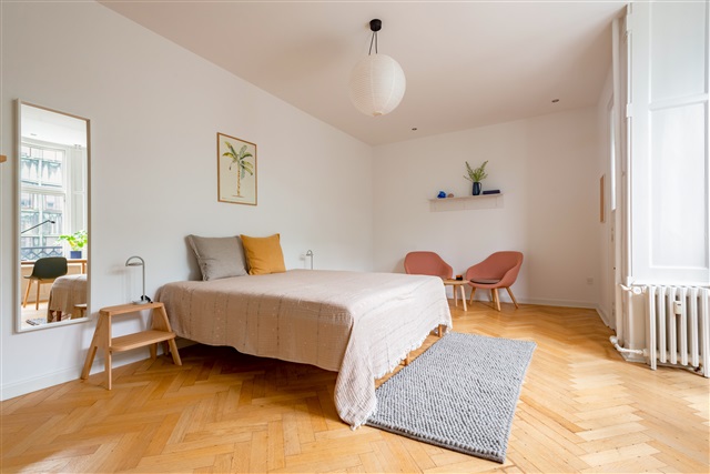 Situated on the fourth floor, this apartment comprises five generously sized rooms, including four that are ideal for double occupancy and one designed for a single occupant. The residence features a large living area, an open-plan kitchen, and a snug library corner perfect for unwinding. Additionally, there are two full bathrooms along with a separate guest toilet.