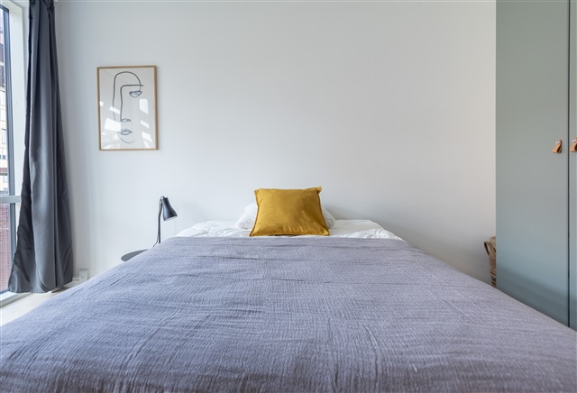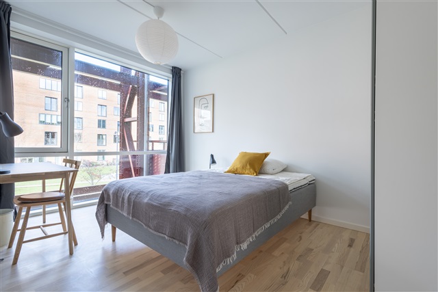 The apartment named 'Thor' is set to become available starting January 17th, 2022. Situated as a duplex spanning the ground floor and first floor within a contemporary building, it is located in the developing neighborhood of Valby. This residence features four individual bedrooms, two generously sized communal bathrooms, and a living area that includes a modern open-plan kitchen with access to a private terrace.