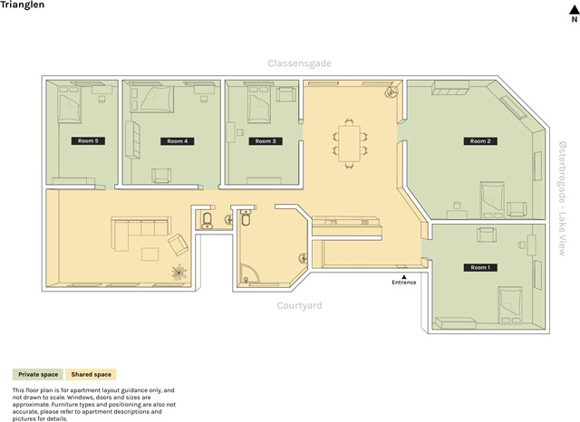 Move into Trianglen and wake up to a view of Copenhagen’s iconic “Lakes” in the heart of the city. This beautiful apartment is flooded with natural light year round and boasts centralized access to all the city has to offer. Are you a jogger? Then this apartment is perfect for you! Throw on your shoes and get out for a run around the lake trail. Hoping for the perfect location to have a cup of coffee and people watch? Just head downstairs and pick your place, there’s plenty to choose from. If you’re here on New Years, you will be front row for one of Scandinavia’s best fireworks displays. Trianglen has four spacious single rooms and one luxurious large room, a large bathroom, an open central kitchen and dining space and a secluded living room with comfortable seating that’s perfect for getting some work done or enjoying your morning cup of coffee. A city lover’s dream location, Trianglen is the perfect spot to settle in.