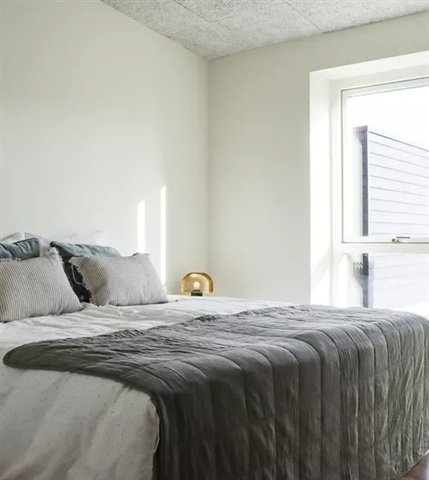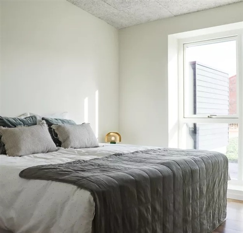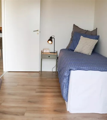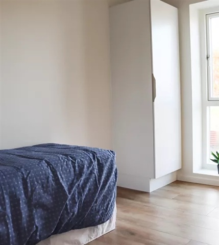 The property comprises a master bedroom and an additional room positioned at opposite ends of the house. The main bedroom includes three built-in tall cupboards and offers enough room for a double bed, bedside table, and extra storage. The second room, which opens directly from the living room, is versatile and can serve as a child's bedroom, an office, or a hobby space.