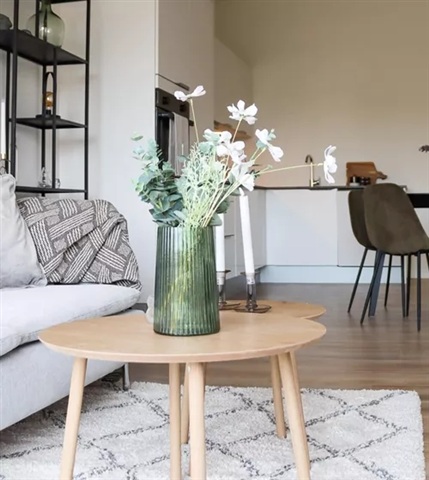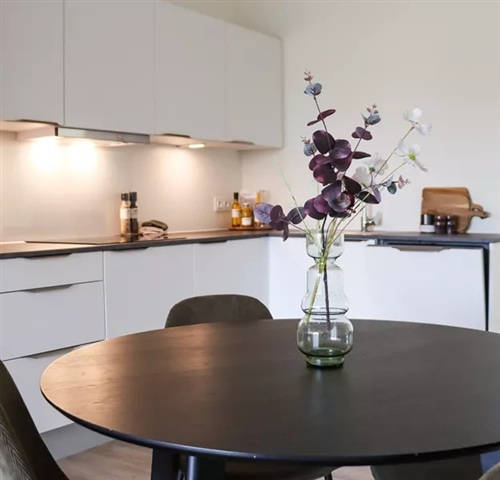 This charming three-room townhouse features underfloor heating and a ventilation system. Please note that all images, visualizations, and floor plans are for guidance only.The kitchen and living area flow seamlessly into one another, creating a harmonious living space. Located in one corner of the room, the angled kitchen allows ample space for both a dining table and a cozy living area further inside. The kitchen is crafted from light-colored materials and comes fully equipped with all major appliances. From the dining area, direct access leads out to the home's terrace.