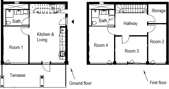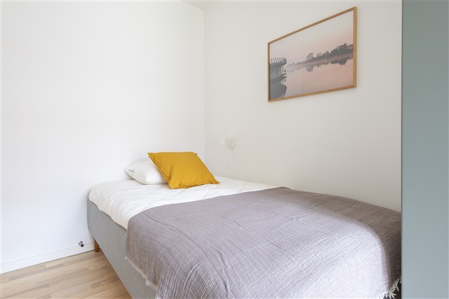 The apartment named 'Thor' will be available for occupancy starting January 17, 2022. Situated within a contemporary building in the developing area of Valby, this duplex spans the ground floor and the first floor. It features four individual bedrooms, two large communal bathrooms, and a living area that includes a stylish open-plan kitchen with access to a private terrace.