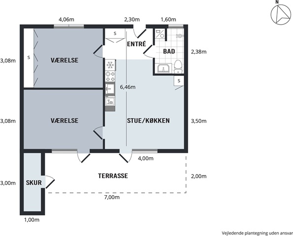 Situated on the ground floor, this three-room apartment features a spacious open-plan kitchen and living area, along with two well-sized bedrooms. From the kitchen space, there is direct access to a private terrace and garden. The kitchen comes fully equipped with all major appliances, including a fridge-freezer, oven, stovetop, and dishwasher. The bathroom is fitted with underfloor heating and includes its own laundry column. Additionally, a convenient private shed is accessible from the terrace. Keeping a dog or a cat is permitted upon agreement.