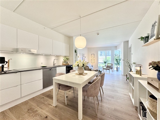 Skovly offers more than just housing; it provides access to expansive green communal spaces designed to foster tranquility and a sense of community. Atop the building, residents will find a beautifully designed orangery alongside a spacious shared rooftop terrace, perfect for enjoying views and socializing with neighbors. Gardening enthusiasts also benefit from available greenhouses where they can cultivate their own vegetables and plants.The apartments themselves are bright and contemporary, featuring high-quality materials throughout. Each living room opens onto a private terrace or balcony, seamlessly blending indoor living with outdoor spaces.