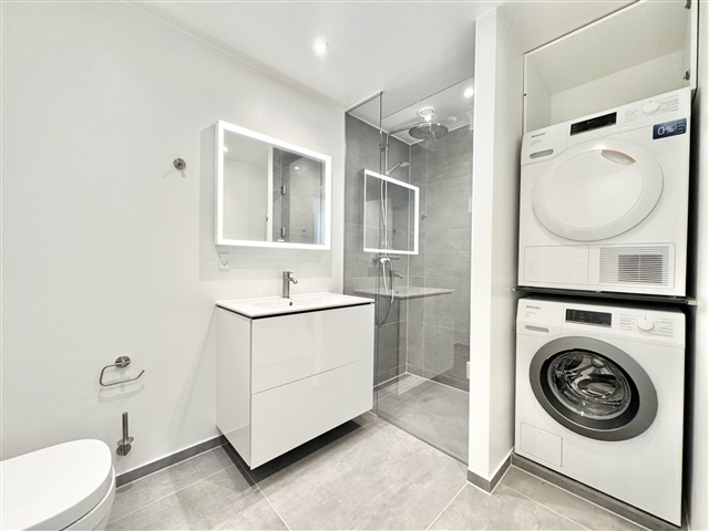 The bathroom is elegantly outfitted with high-quality tiles, a modern shower enclosure, and fixtures from renowned brands Duravit and Grohe. Comfort is enhanced by underfloor heating, and both a Miele washing machine and dryer are installed within the bathroom, simplifying daily chores. An integrated SONOS speaker allows residents to listen to favorite music or podcasts with excellent sound quality while unwinding.