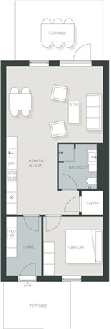 Dreaming of swapping your apartment for a townhouse? Replacing your permanent home with a rental property? Or are you looking for your first home together as a couple? Then this 2-bedroom townhouse is the perfect choice for you. Here you get a newly built and energy-friendly townhouse in Stenlille.Welcome insideWhen you enter the home, you'll be welcomed by a practical entrance hall with a beautiful gray tile-look floor. Here you'll find a washbasin and plenty of space to store your outerwear and shoes in the fixed white cabinets. The wardrobes are repeated in the bedroom and bathroom.There is underfloor heating and ventilation throughout the apartment to ensure the best indoor climate.Kitchen-dining room and living room in oneFrom the entrance hall, you have a lovely kitchen-dining room with a living room in extension. The kitchen is in a white timeless design from HTH with all white goods. From here, there is a direct view of the green areas that surround the home. The large windows provide a fantastic influx of light into the room.The home's outdoor areasOn the entrance side you have a small terrace and shed, as well as private parking. On the other side of the home, you have access to a larger terrace where you can enjoy a quiet morning or warm summer evening.