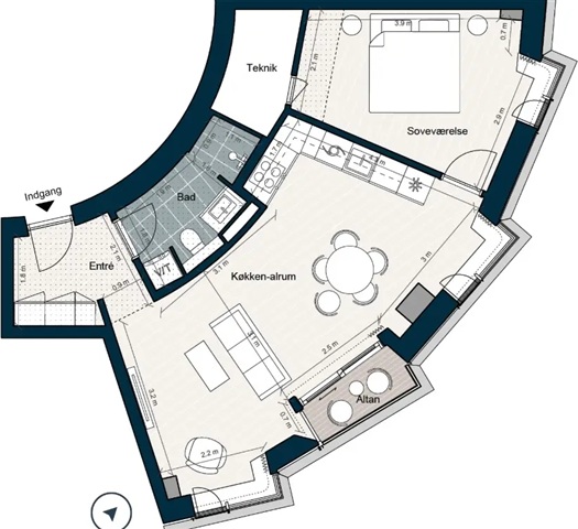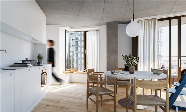 An opportunity has arisen to become the inaugural tenant in one of the distinctive round towers of Postbyen. These towers have already established themselves as a new landmark within central Copenhagen, and now you have the chance to reside in one of them. Move-in is scheduled from February 2026 onward, with residences ranging in size from two to seven rooms, all featuring balconies that offer views over the vibrant urban environment below.Living in Postbyen means becoming part of a newly developed and dynamic urban neighborhood where hotels, shops, restaurants, cafés, and much more are within reach. Your home is surrounded by striking architecture, and just beneath your front door lies a city park, winding lushly and green through the area. Whether you choose a two-room or seven-room apartment, each dwelling offers a distinctive experience characterized by non-standard, curved layouts. The circular residential towers create unique angles, cuts, and corners, allowing you daily enjoyment of living in a home where walls, floors, and ceilings defy traditional right-angled design.