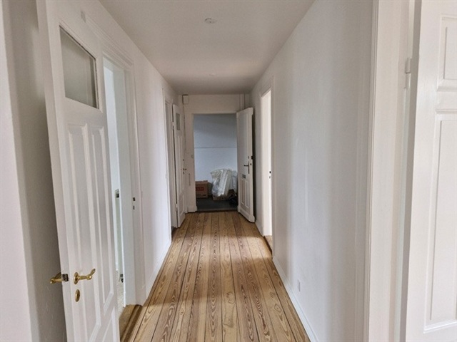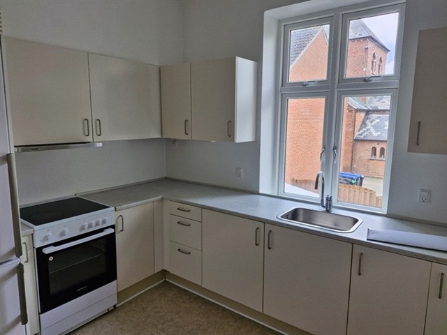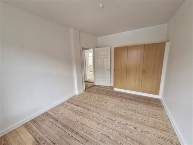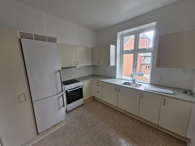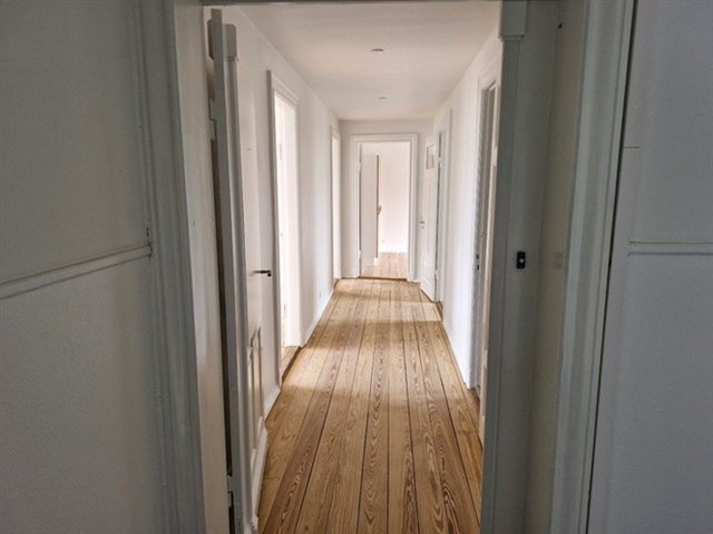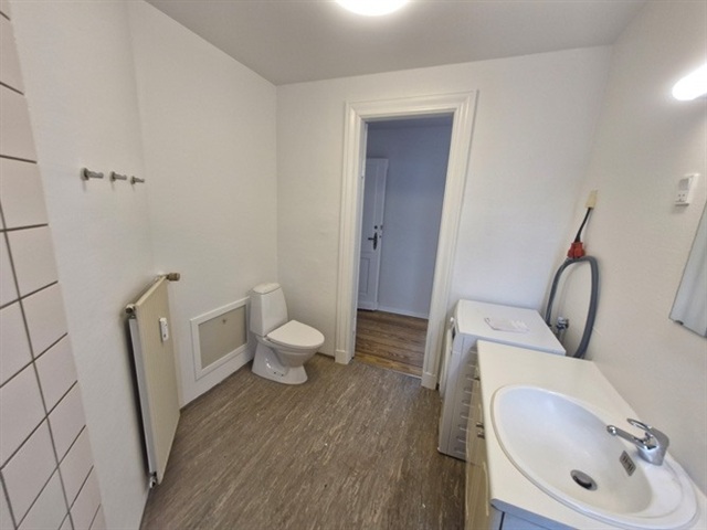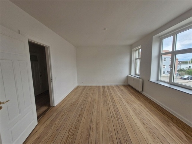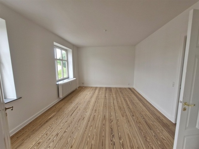 This rental apartment in Haderslev offers 104 square meters of living space spread over three rooms. The residence is bright and elegant, featuring wooden floors throughout the three well-proportioned rooms. It is conveniently situated close to the pedestrian street and provides a pleasant view. The kitchen is modern and equipped with a dishwasher, washing and drying machines, a refrigerator-freezer, stove, and oven. Additionally, the apartment includes a bathroom and an entrance hall. Storage is available in a basement cellar, and there is parking possible nearby.