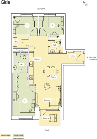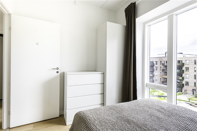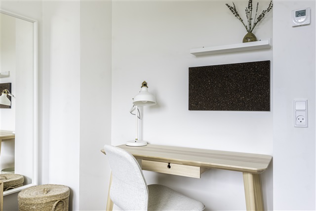 This contemporary apartment features elegant wooden flooring throughout, complemented by expansive double-glazed windows and a central heating system. It comprises three bedrooms alongside an open-plan kitchen and living room area that incorporates both a dining space and a lounge equipped for television viewing. In addition, there is a separate storage room housing the washing machine and dryer. The accommodation includes one communal bathroom, while the third bedroom benefits from a private ensuite bathroom. From the kitchen and living room area, residents can step out onto a generously sized shared balcony. The property also offers a pleasant green courtyard with ample bicycle parking available.Each bedroom comes furnished with a high-quality bed complete with bedspread, duvet, and pillows, as well as a bedside table fitted with a reading lamp. Work needs are catered for by a desk accompanied by a chair and a desk lamp. Clothing can be stored efficiently in wardrobes featuring hanging rails and drawers, with additional storage boxes located beneath the beds. The rooms are further equipped with curtains, mirrors, laundry baskets, trash cans, rugs, and decorative items to enhance the living environment.