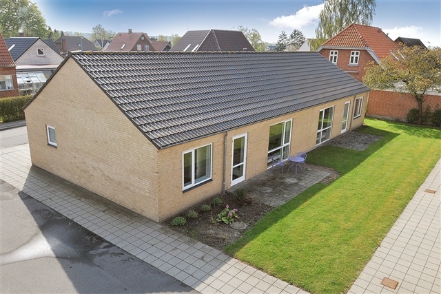 The section is strategically positioned near the town center and schools. It includes yellow-brick single-story row houses on Mejerivænget and two-story buildings on Aagade, which also feature elevators. Constructed in 2005, this area lies in the northern part of Tørring. Apart from half of Aagade's apartments that require use of an external staircase to access the first floor, there are no steps inside the units, making them suitable for residents with mobility challenges. A communal room is available with seating for approximately 25 guests and bedding for up to four overnight visitors. Parking is ample, and Mejerivænget is a cul-de-sac, contributing to minimal traffic flow.